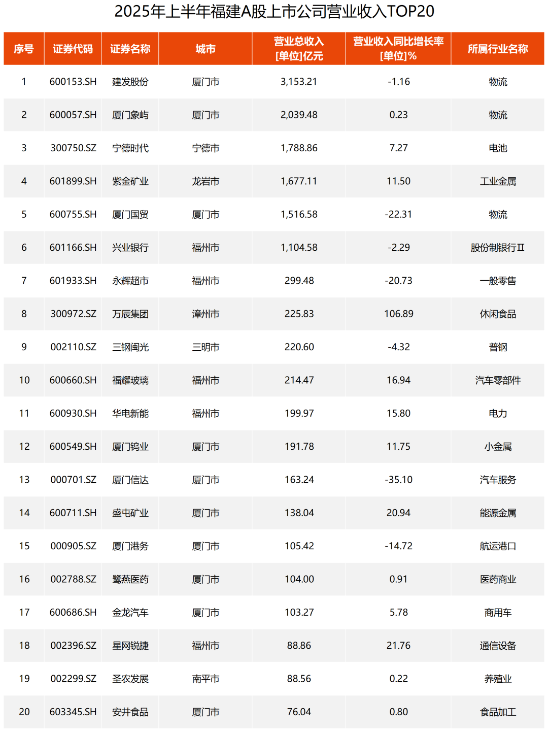根據福建A股企業半年報數據顯示,目前福建千億營收俱樂部成員共有6家,依次為建發股份(600153.SH)、廈門象嶼(600057.SH)、寧德時代(300750.SZ)、紫金礦業(601899.SH)、廈門國貿(600755.SH)、興業銀行(601166.SH)。