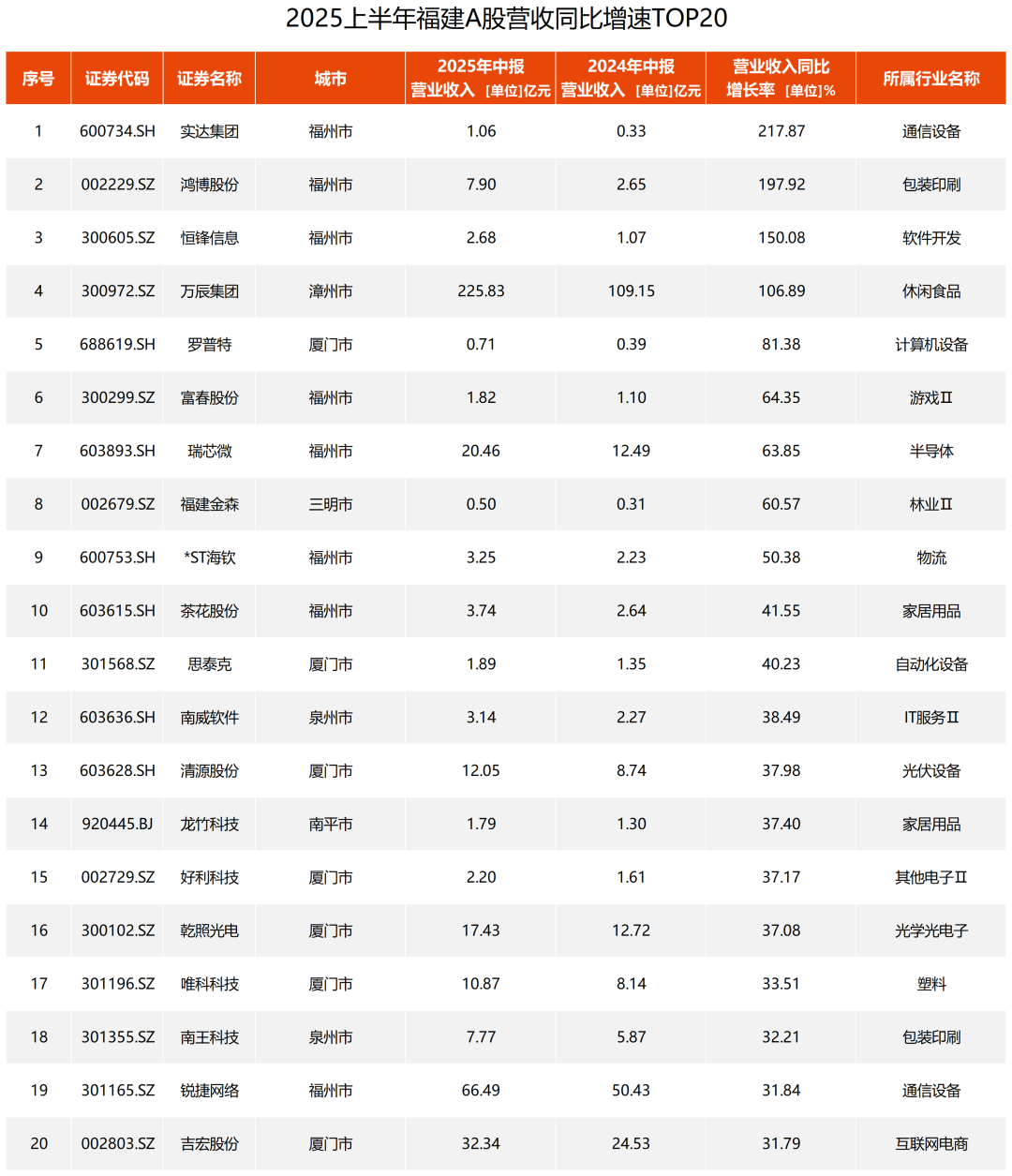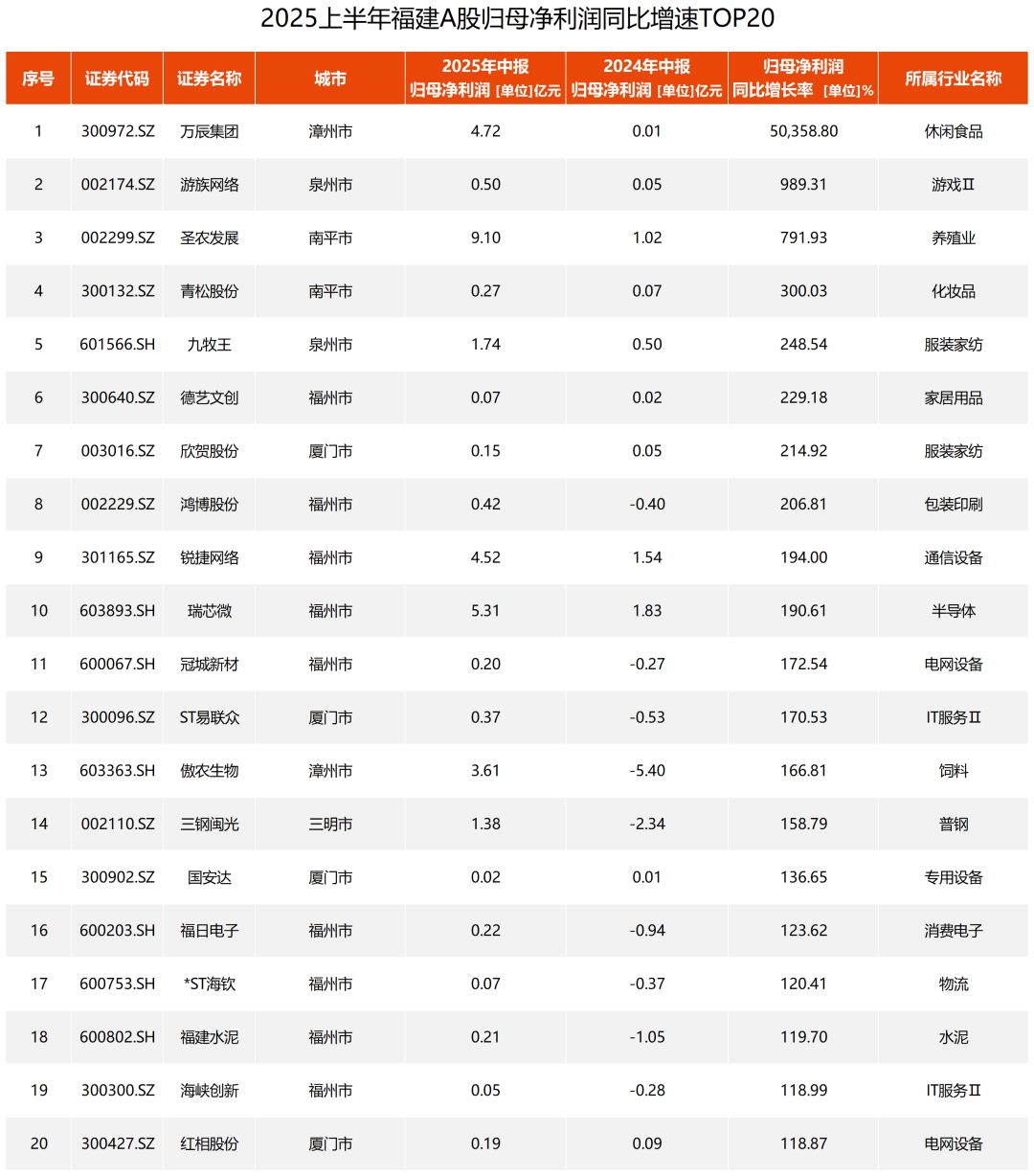 歸母凈利潤同比增速榜單,同樣存在“小基數”造就“大增速”的情況。整體來看,上半年萬辰集團(300972.SZ)、游族網絡(002174.SZ)、圣農發展(002299.SZ)三家企業歸母凈利潤增速超500%;青松股份(300132.SZ)、九牧王(601566.SH)、德藝文創(300640.SZ)、欣賀股份(003016.SZ)、鴻博股份(002229.SZ)等5家企業歸母凈利潤增速均在200%以上;共有25家福建A股上市公司歸母凈利潤增速超100%。