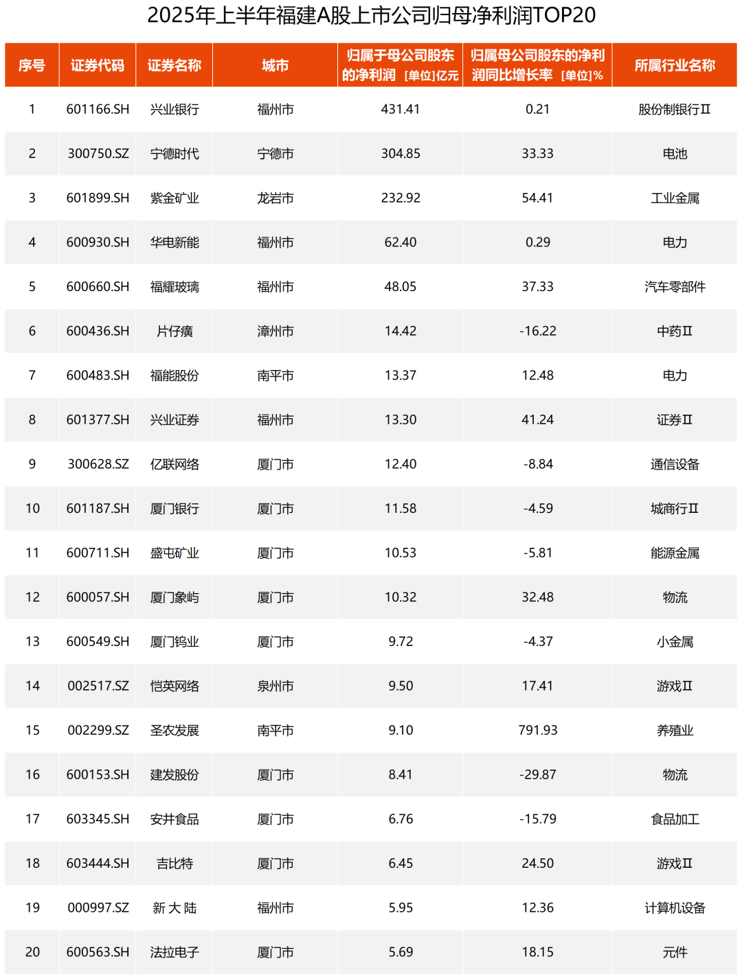 在凈利潤方面,2025年上半年度有12家福建A股上市公司的歸屬母公司股東凈利潤超10億元。興業銀行(601166.SH)蟬聯福建A股上半年最賺錢的企業,歸屬于母公司股東的凈利潤達431.41億元。