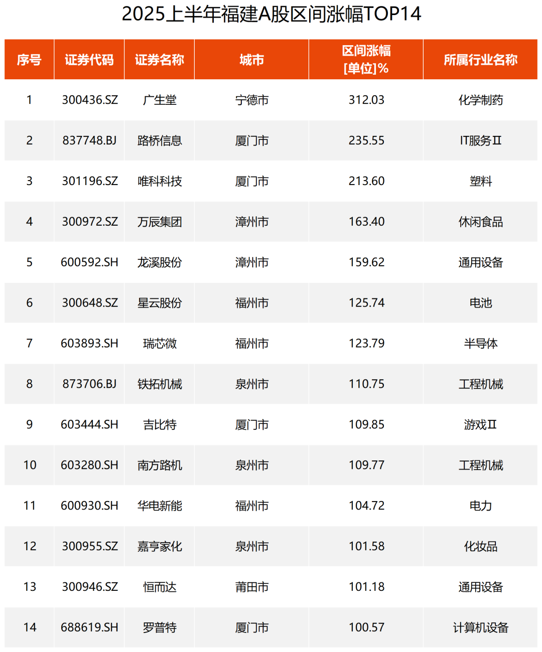 其中,廣生堂(300436.SZ)以313.03%的區間漲幅位居福建A股第一,其次路橋信息(837748.BJ)、唯科科技(301196.SZ)、萬辰集團(300972.SZ)、龍溪股份(600592.SH)四家企業的區間漲幅分別達235.55%、213.60%、163.40%、159.62%。
